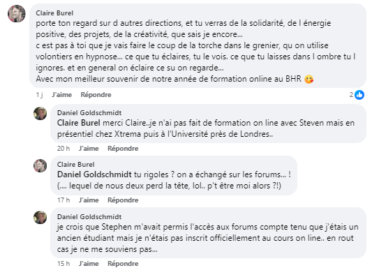 Franck Mahia était présent à la formation « Hypnose & neurosciences » dispensée par Dr Sylvia Morar et organisée par Daniel Goldschmidt, dont il a effectué un retour publicitaire en postant un copte-rendu sur les groupes « HYPNOSE » et « Hypnose profonde ».
