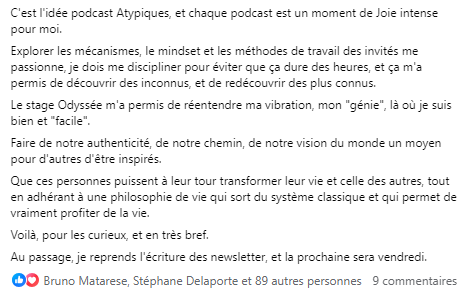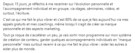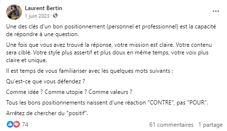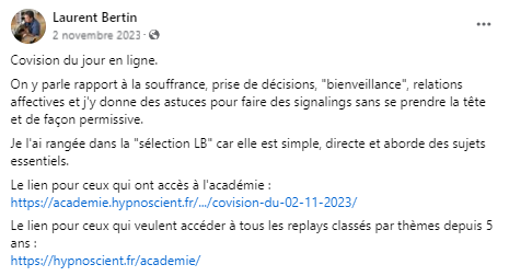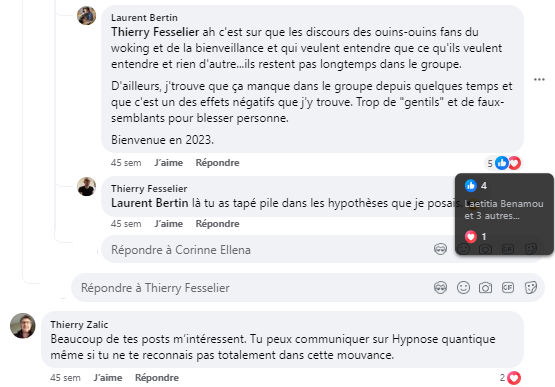 Laurent BERTIN pense encore être un influenceur et se sent légitime à nous parler de « bon positionnement », comme s’il était un exemple à suivre. Alors que depuis des années, les gourous de « l’hypnose nouvelle » ont joué de confusion et d’inversion et que pour réussir à se développer, il conviendrait de faire exactement le contraire de ce que les manipulateurs prônent. Se positionner pour la justice, la paix, l’amour, la vie (et donc contre l’injustice en effet, la violence et la colère, la haine de l’autre qui poussent à la détresse, au burn’out et peut occasionner des dépressions, voire des suicides et la mort).