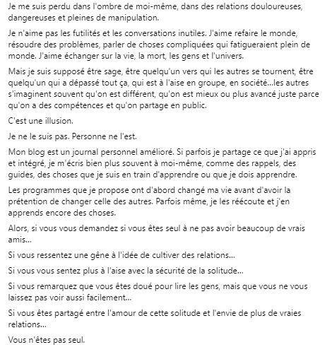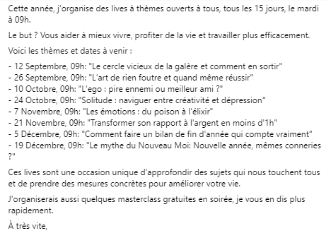 Pendant 10 mois, Laurent BERTIN a publié des articles quotidiens pour manipuler l’IA et les internautes à qui il espérait vendre un nouveau produit en ligne qu’il a appelé « Ecosystème » et qui a été un bide total, car les disciples ont vu clair dans son jeu de manipulation qui n’est pas désinteressé, avec ses pseudo-contenus « gratuits » qui visent à faire de nou.es des produits financiers pour lui permettre d’assurer son train de vie de fainéant manipulateur provocateur sadique et hautain.