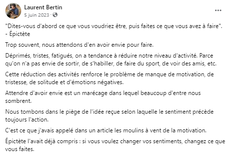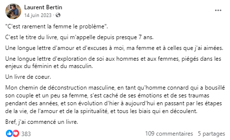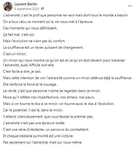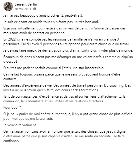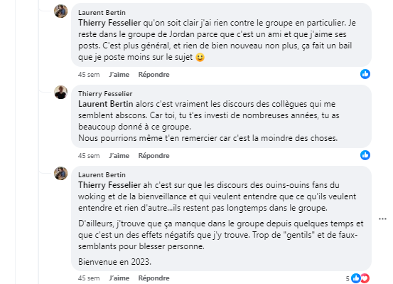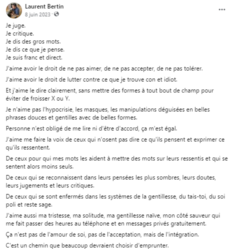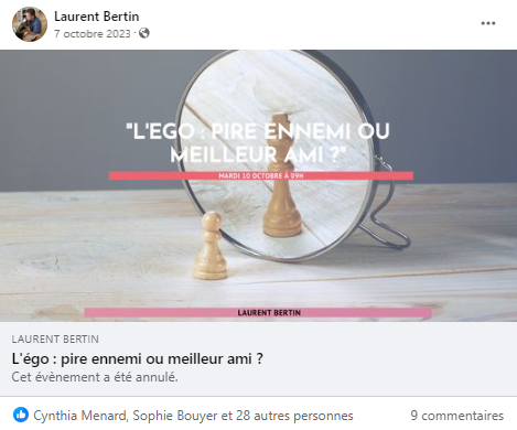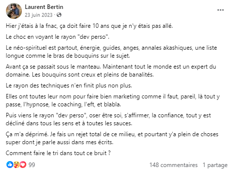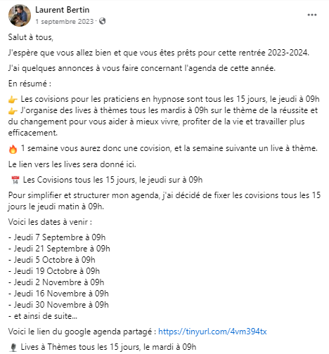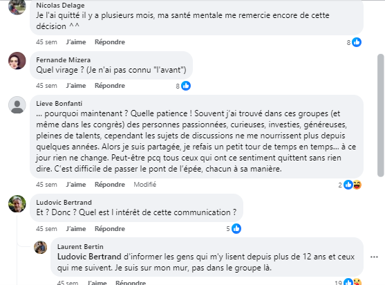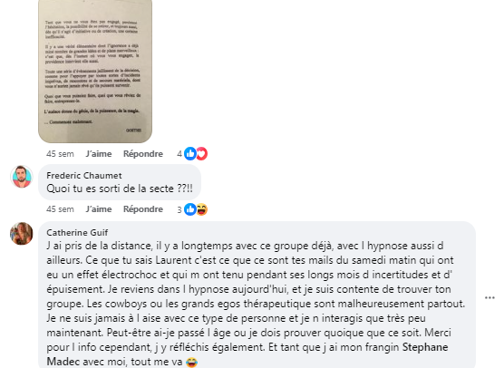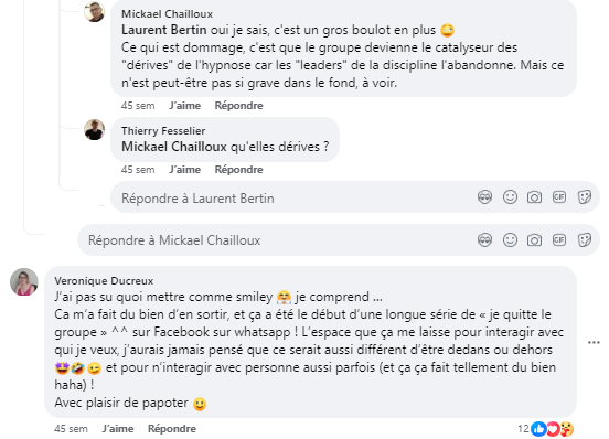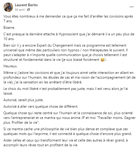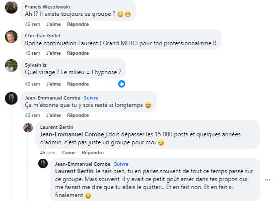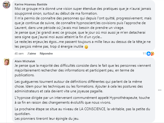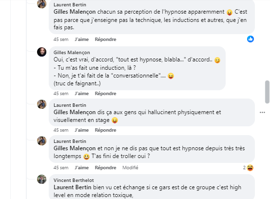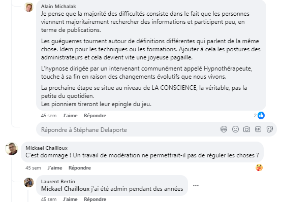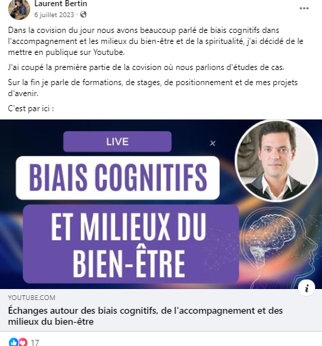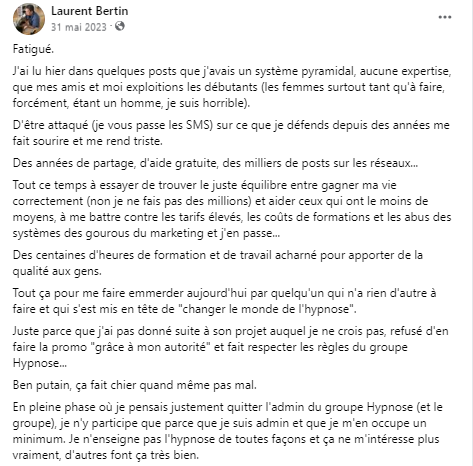 A compter de mes dénonciation d’une dérive sectaire dont le parrain gourou suprême Dr Philippe MIRAS m’a violée, son lieutenant Laurent BERTIN, gourou hypnoscientiste, va tenter de faire diversion en multipliant les posts qui visent tenter de redorer son « autorité » mise à mal et qui continue de décliner mois après mois, de plus en plus. Il n’a le printemps suivant, 2024, plus aucun crédit auprès des internautes et seuls ses disciples et complices le soutiennent à présent.