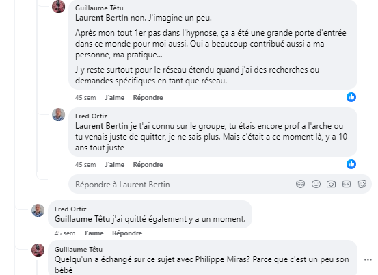 Dr Philippe MIRAS met en valeur ses mentors, dont il assure la promotion et la création d’Autorité comme on le voit sur la page consacrée à la publicités de Laurent BERTIN sur « Hypnose (archive) » et à celle concernant du lancement de la Secte Hypnoscient.