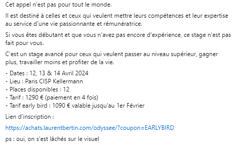 Laurent BERTIN l’hypno-marketeur joue sur l’image de la rareté. Ce qui est rare étant d’autant plus précieux et valorisable. Pour que les disciples se ruent sur « l’opportunité » du manipulateur en galère…