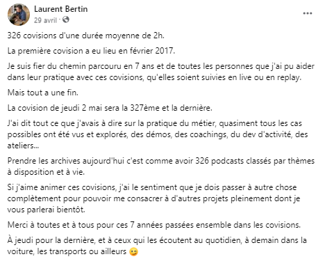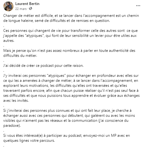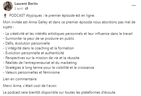 On sait bien qu’une personne interviewée a tendance à partager son interview à son réseau, ce qui offrirait une visibilité nouvelle et « gratuite » à Laurent BERTIN à qui ça aura coûter quelques heures (réalisation/montage basic) qui sont un investissement marketing.