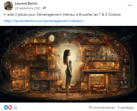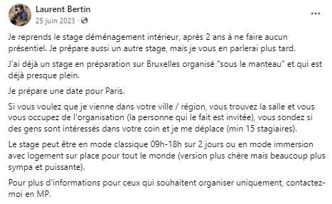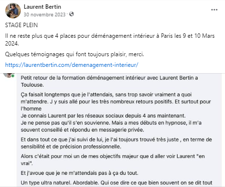Laurent BERTIN avait affirmé pendant des années ne plus faire d’hypnose et ne plus donner de stages. Il comptait uniquement, officiellement, sur la vente de ses produits en ligne. Il semblerait qu’il ait besoin de mettre du beurre dans les épinard et soit contraint à reprendre son bâton de pèlerin de l’hypnose et des déménagements intérieur, avec story-telling et placement de produits EDQ et EDC…